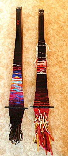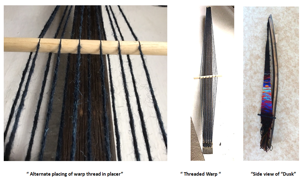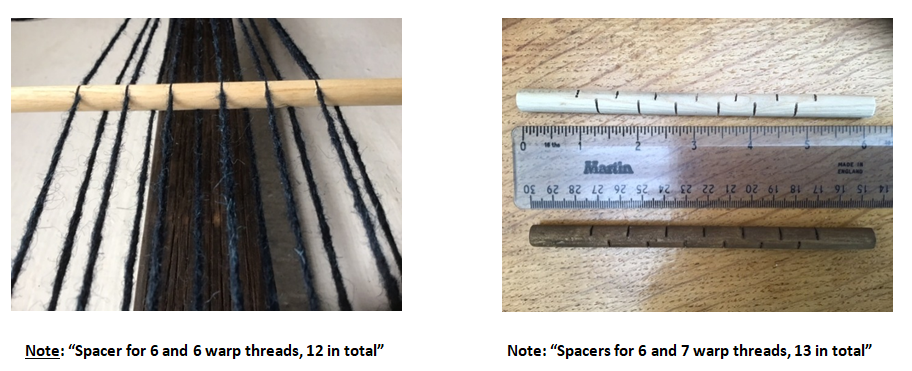 The spacer is used to give width to the warp and can be placed higher or lower on the warp as needed. I use 1 cm or 3/8th of inch dowel which can be stained as required. Marks are made from the centre at about 1 ½ cm or 5/8th of an inch. Working from the top and alternately beneath as in the above image the marks coincide with the exact number of warp threads. Then a saw is used to cut a groove approximately half way across the dowel. This can then be inserted between the warps alternatively top and bottom. Make sure the warps are held in the cut grooves and avoid twisting of the warps.