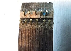View of Brass pins at top, similar the bottom. Side views and Back view of Stave