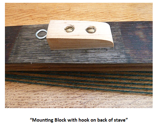 The concave shape of a barrel stave with tapering sides is particularly suited for use as a loom. When warped it has an affinity with the sounds of a musical instrument. Before proceeding I need to consider a theme or concept. Having a distinctive shape, a vertical idea and a landscape or similar form might be suitable. From a primary experience, photograph, sketch or painting I conclude the colour necessary for the warp. This will be visible at the top and bottom and might also be seen within the woven element. At this stage thought must be given to how it will be hung and how to attach on the back a hook or similar. Below is the specific image of a mounted block with hook, but a single large hook positioned carefully will suffice. Care must be taken if the stave is to hang parallel to the wall.